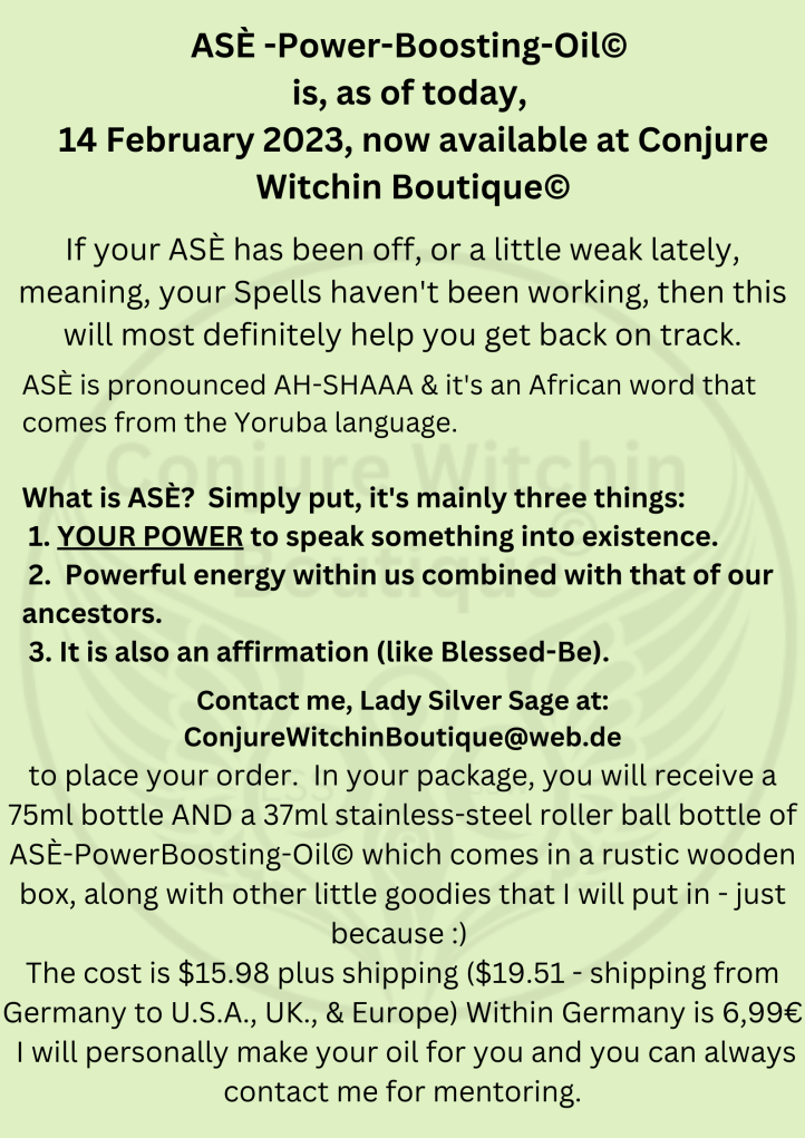 February 14, 2023February 14, 2023 Lady Victoria Silver Sage ASÈ-Power-Boosting-Oil© NOW AVAILABLE at Conjure Witchin Boutique© Happy Valentine’s Day! ASÈ ASÈ ASÈ! Share this: Click to share on X (Opens in new window) X Click to share on Facebook (Opens in new window) Facebook Like Loading... Related